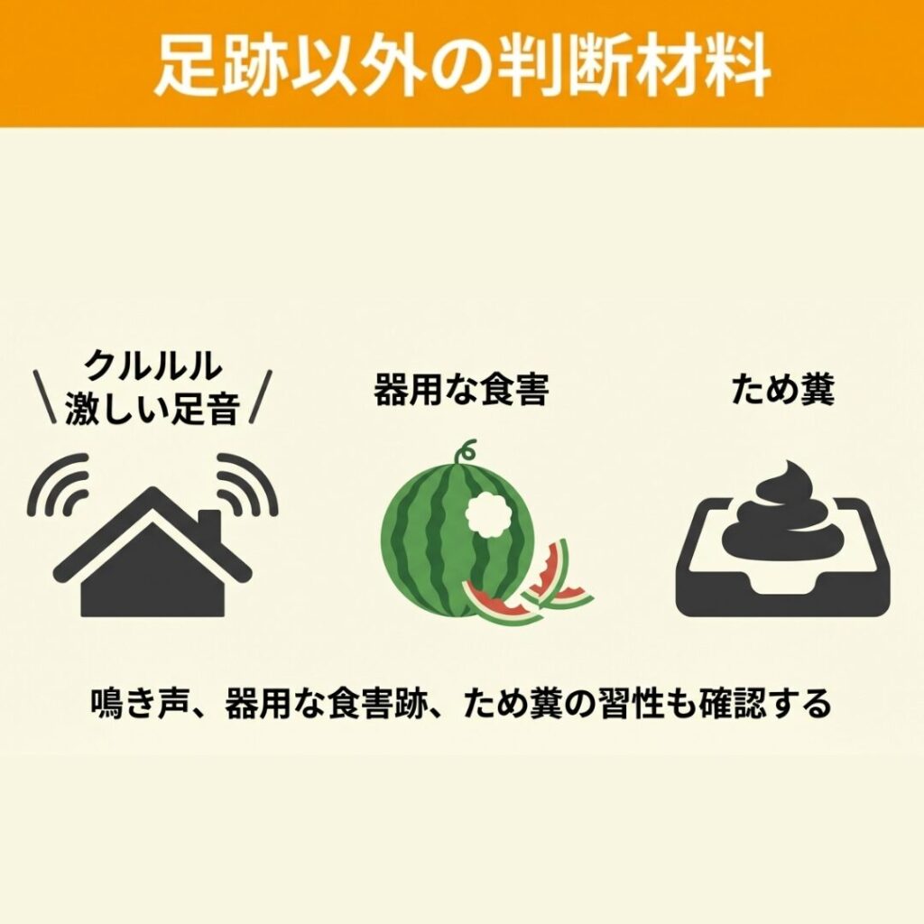 足跡を発見したら、鳴き声、糞尿、食害の痕跡など他の判別方法も併用し、アライグマの存在を確実に特定してください。