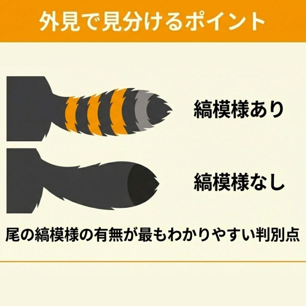 この縞模様はタヌキやハクビシンとの決定的な違いとなるため、覚えておくと役立ちます。