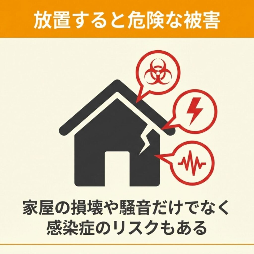 これらの被害が確認された場合、または家屋への侵入が疑われる場合には、速やかに専門業者に相談することをおすすめします。