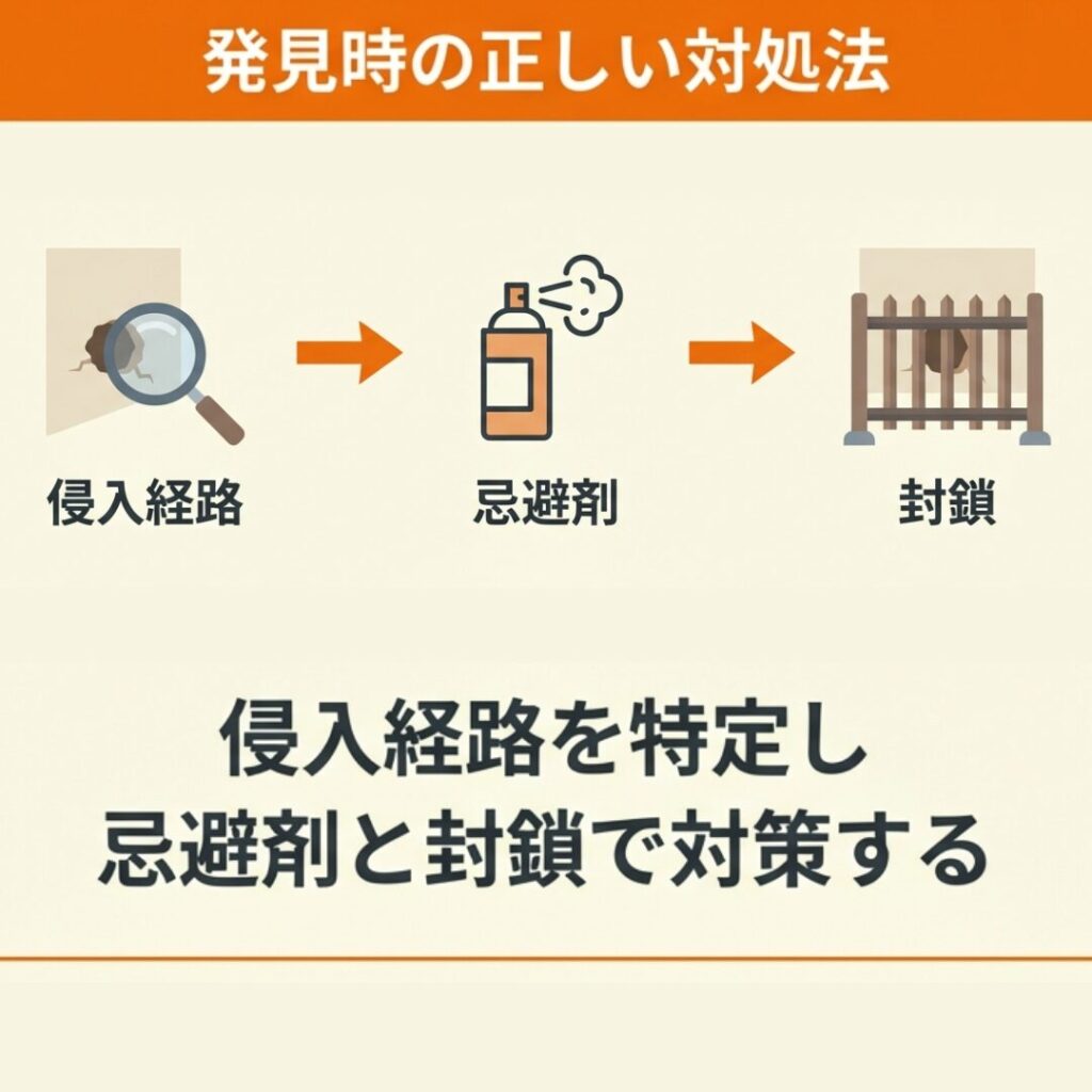 侵入が確認された場合は、法律を遵守しながら、忌避剤による追い出しや侵入経路の封鎖などの対策を講じることが必要です。