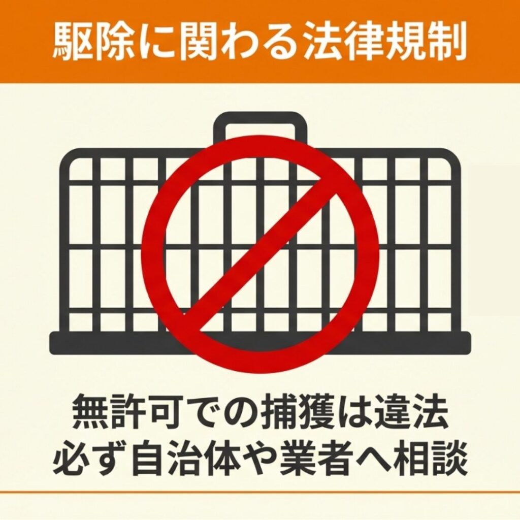 - 個人での無許可捕獲は絶対に避け、適法な手続きを踏むか専門業者に依頼することが賢明