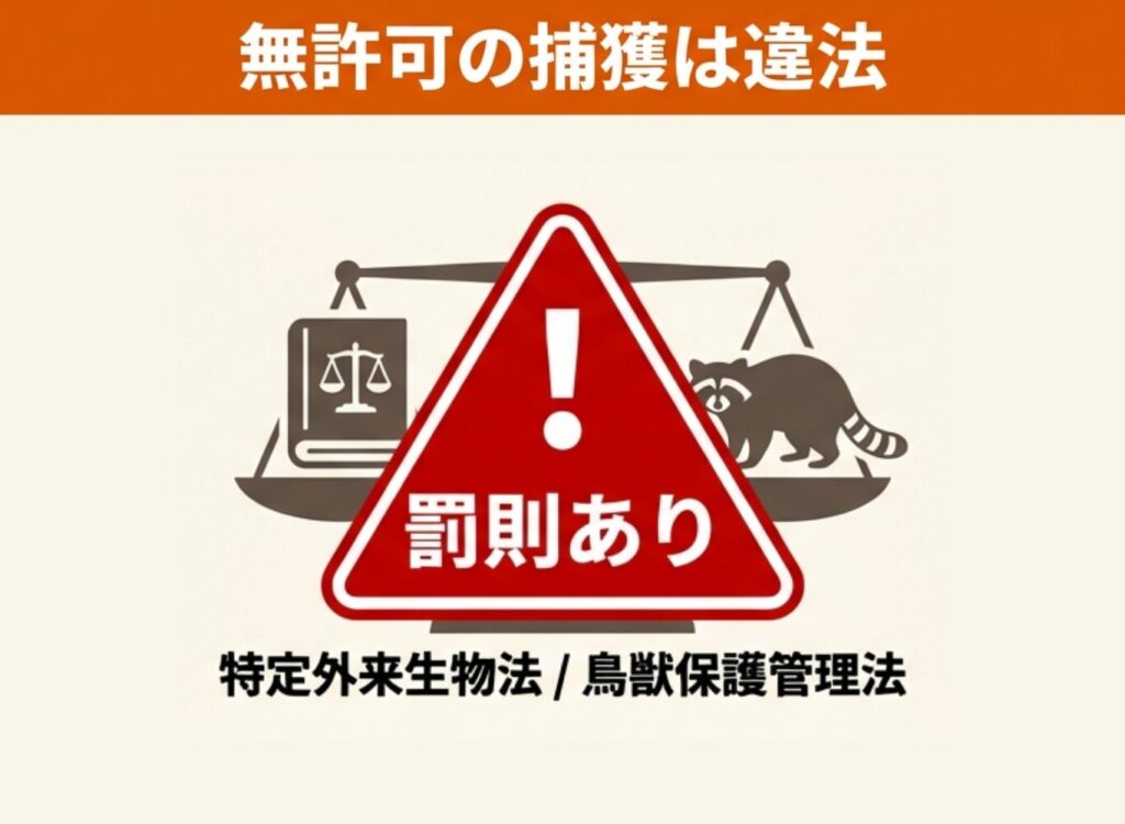 アライグマは特定外来生物かつ鳥獣保護管理法の対象であり、無許可での捕獲は法律違反になります。