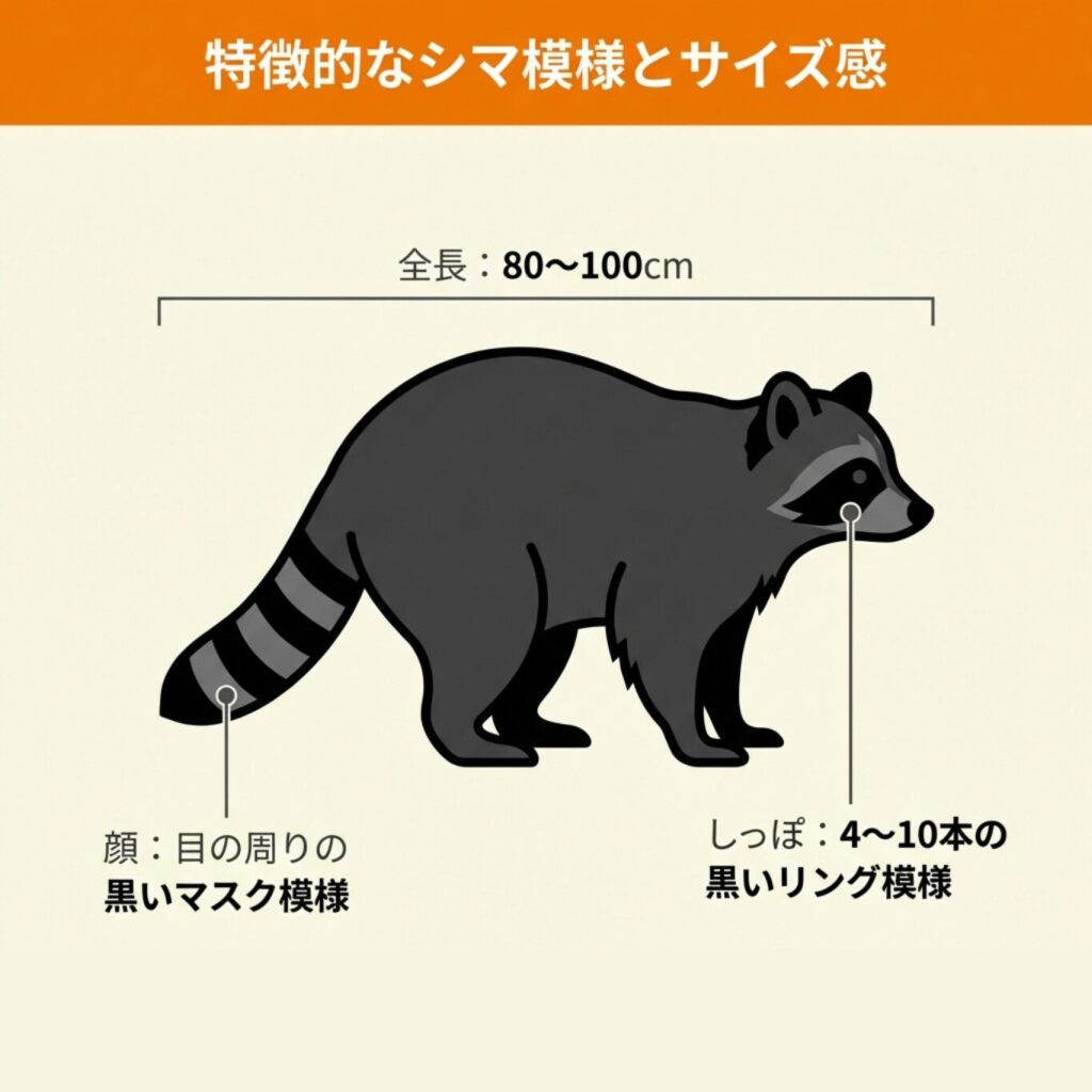 アライグマを他の動物と見分けるポイントを押さえておくと、実際に遭遇したときに素早く判断できます。