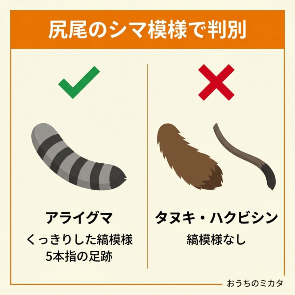 最も確実な見分け方はしっぽの模様で、アライグマは縞模様、タヌキは単色、ハクビシンは先端だけ黒くなっています。