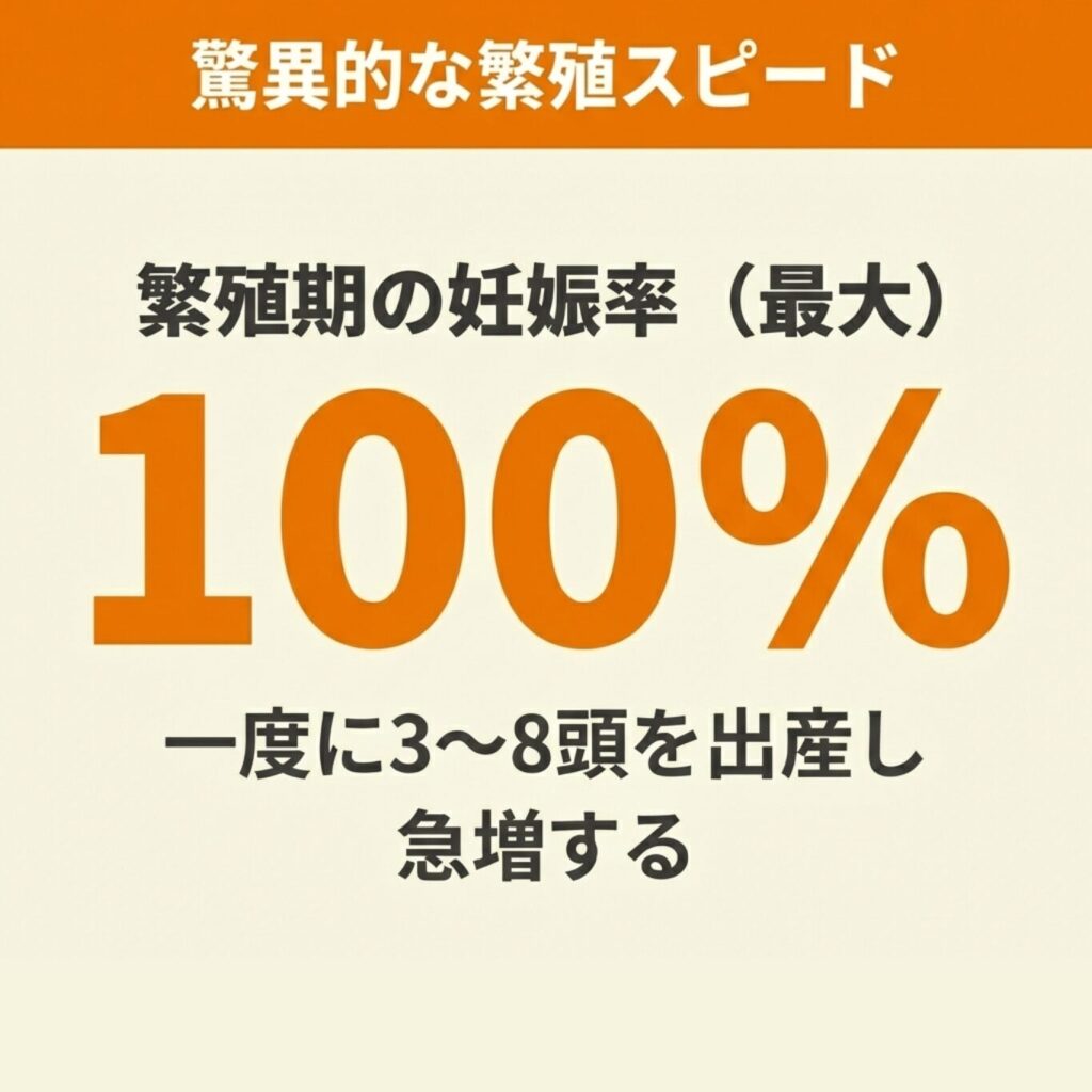 妊娠率も70〜100%と非常に高く、日本には天敵がいないため、放置すると急速に数が増えていきます。