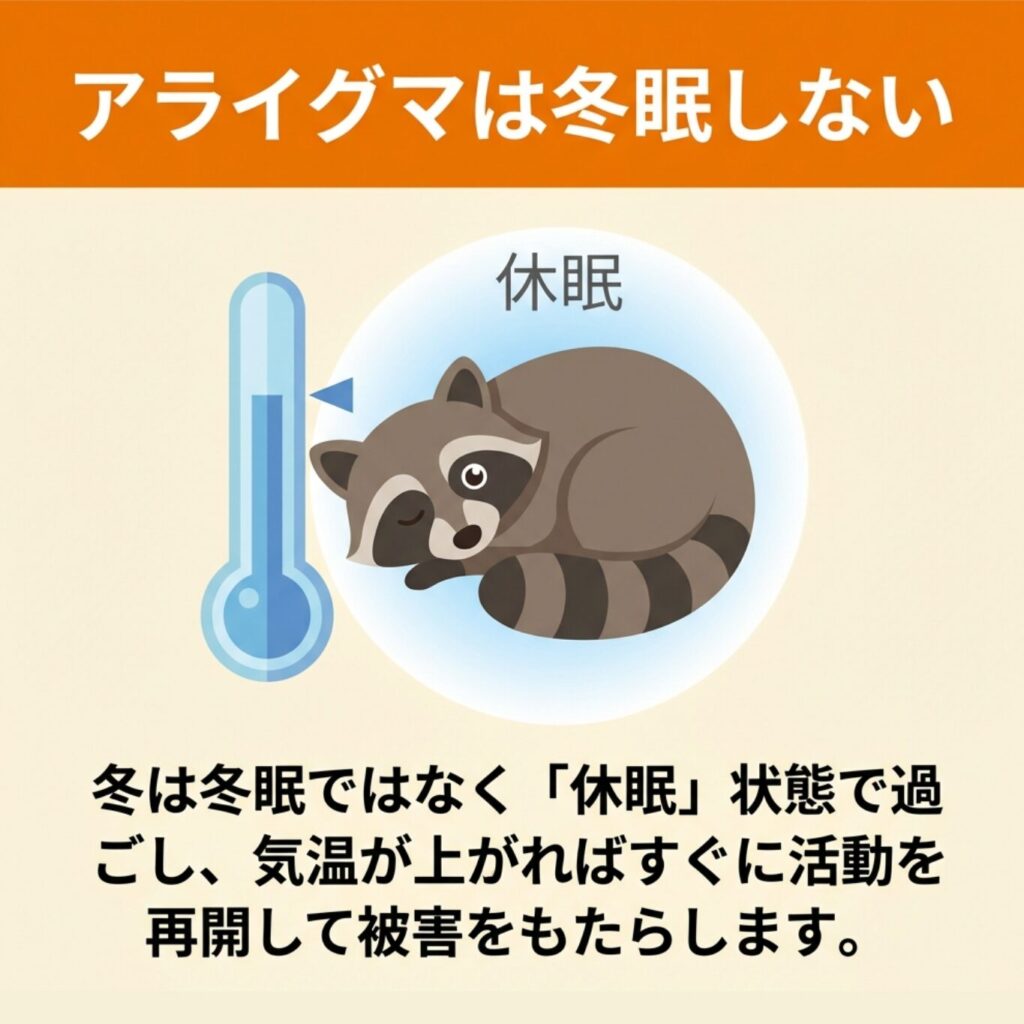 アライグマは冬眠せず、休眠状態で屋根裏や床下に潜んでいる可能性が残るためです。
