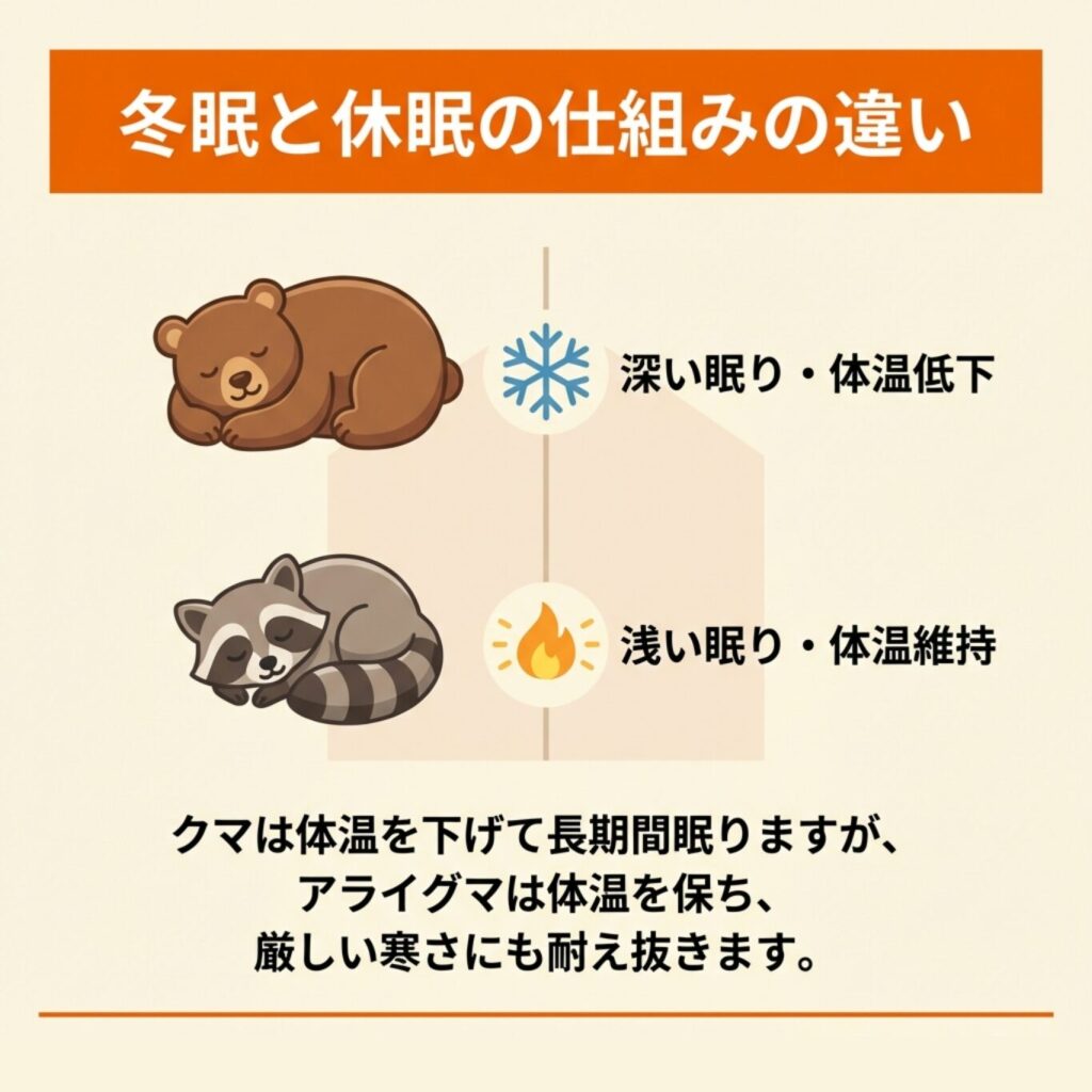 その答えは、冬眠動物とアライグマでは体温や代謝を調整する仕組みそのものが違う点にあります。