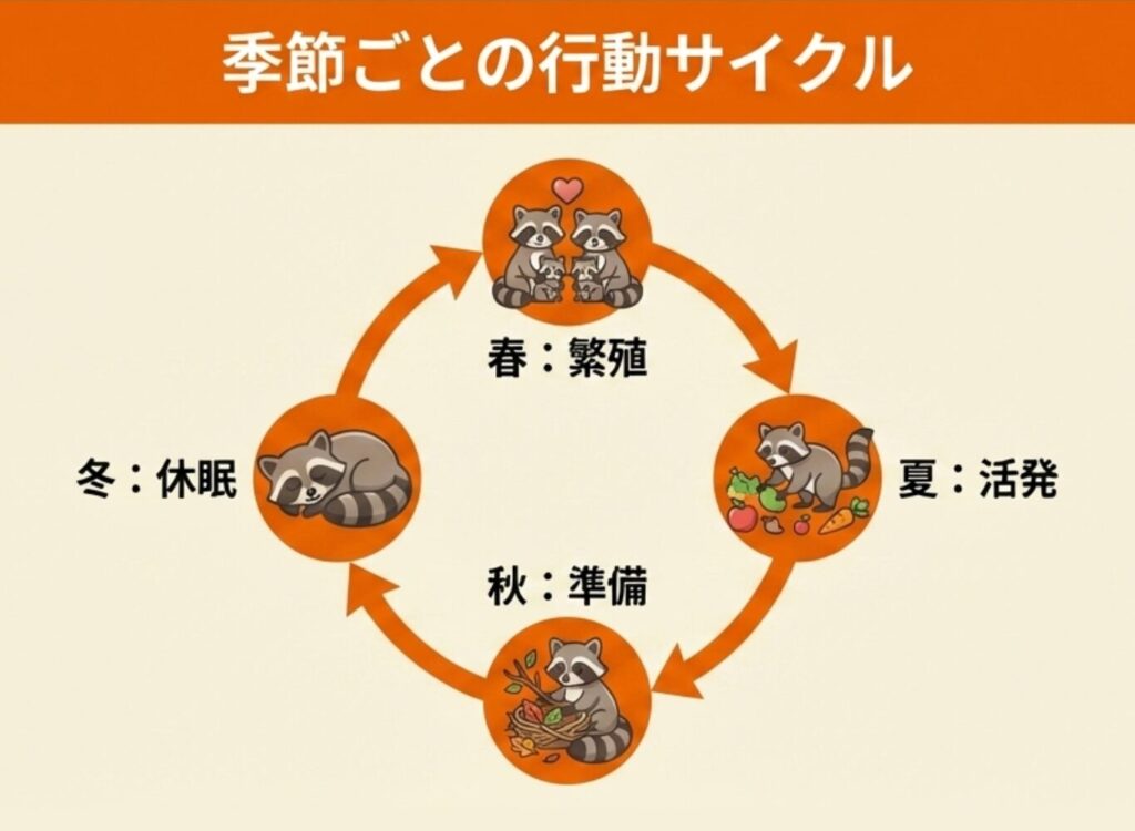 アライグマの行動は一年を通じて一定ではなく、繁殖やエサ確保、越冬準備に合わせて季節ごとに大きく変わります。