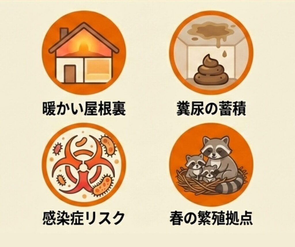 姿が見えなくても屋根裏や床下に潜んでいる可能性があり、糞尿による腐食や感染症のリスクは季節を問わず続きます。