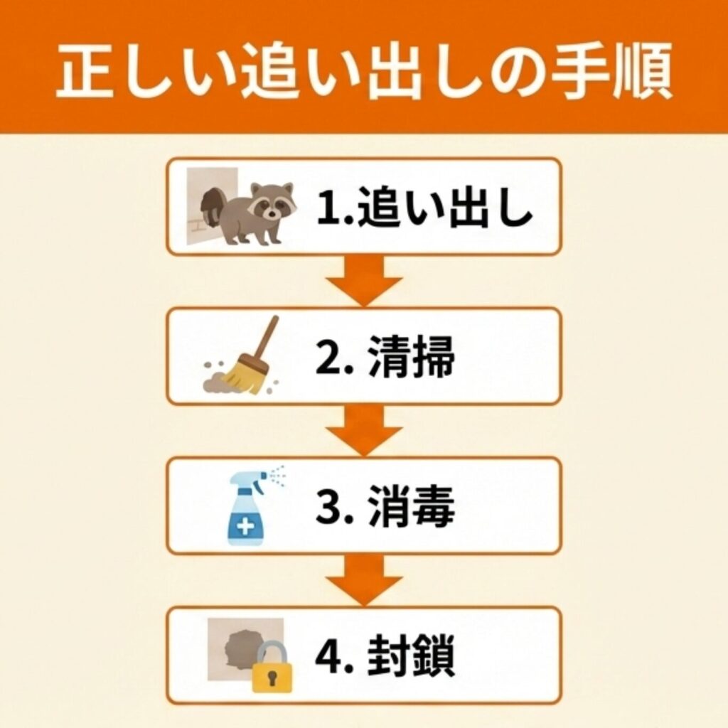 「追い出し→清掃→消毒→封鎖」の4段階を漏れなく実施することが、被害を根本から断つカギになります。
