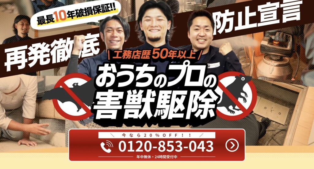 工務店を母体とした完全自社施工のため、追い出しから清掃・消毒・侵入口の封鎖までを一貫して対応できます。