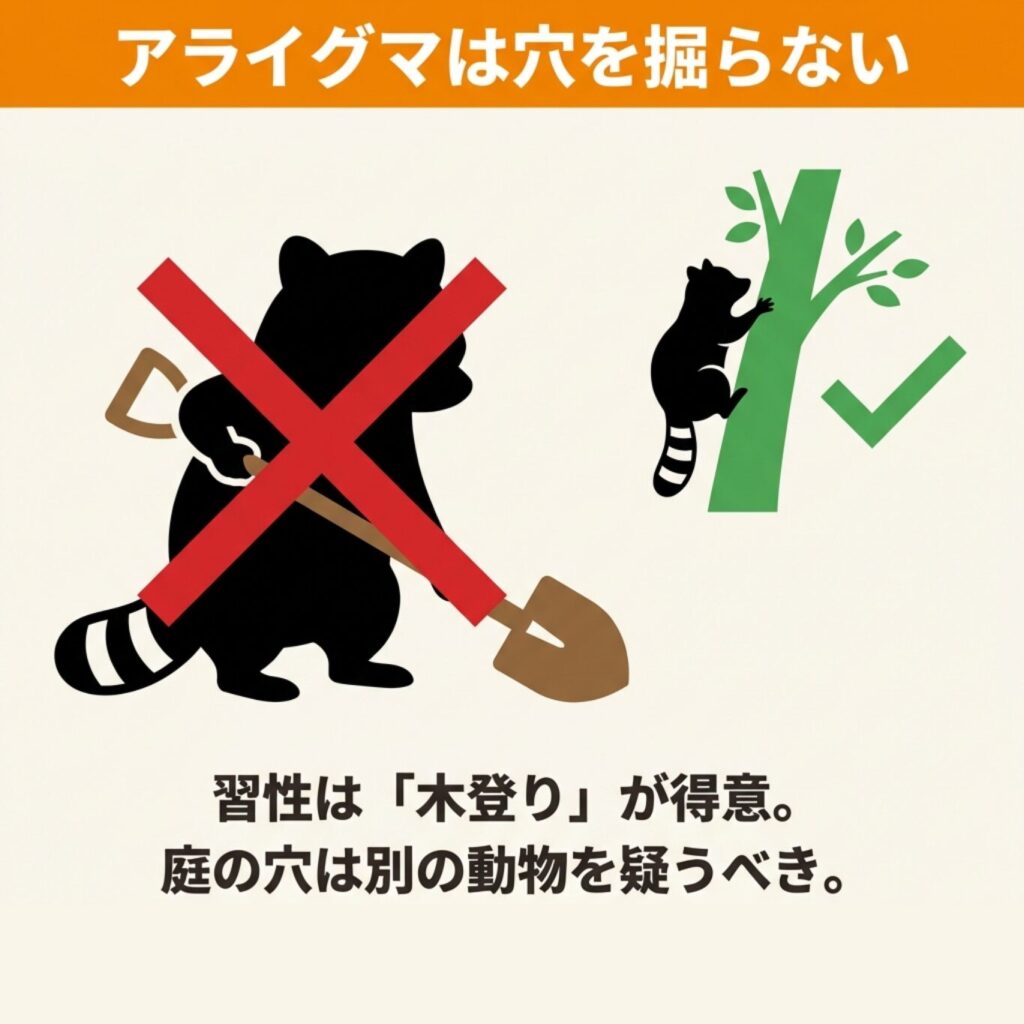 アライグマは木登りが得意で手先が器用な動物ですが、穴を掘る習性はありません。