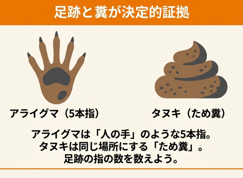 穴の形だけでは犯人がわからない場合は、足跡や糞を手がかりにする方法もあります。