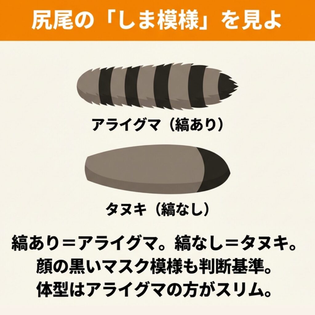アライグマとタヌキを見分ける最もわかりやすいポイントは尾のしま模様です。