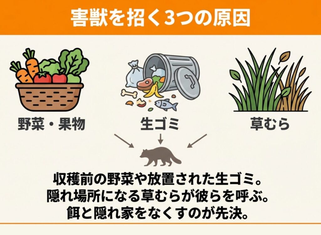 害獣が庭や畑に来る原因としては、作物や生ゴミなどの餌、隠れ場所の多さ、建物の隙間などが挙げられます。