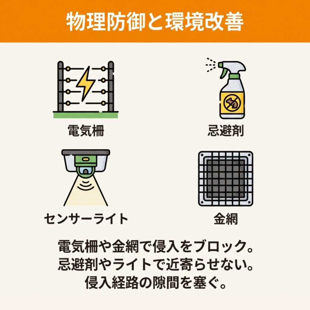 害獣被害を防ぐには、侵入を物理的に防ぐ対策と、近寄らせない環境づくりの両方が大切です。