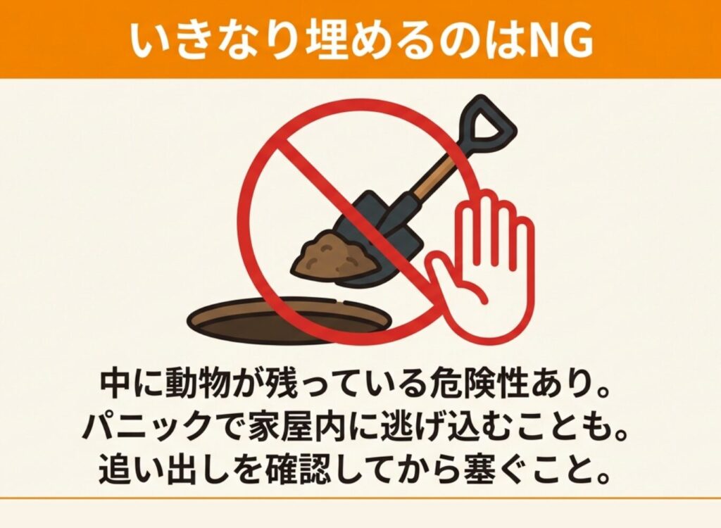 穴を塞ぐ前に、中に害獣や子どもが残っていないかを必ず確認してください。