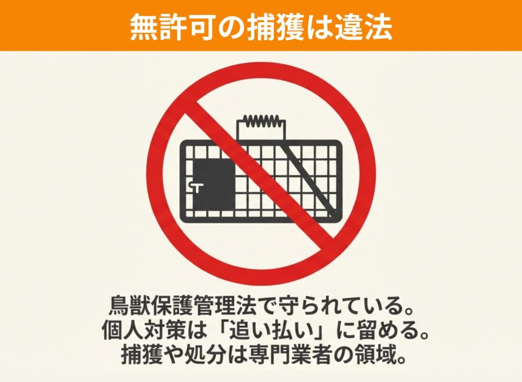 日本では野生動物は鳥獣保護管理法で保護されており、許可なく捕獲することは違法です。