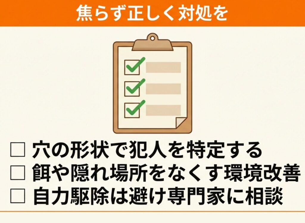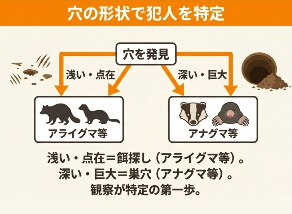 穴を見つけたら、まず深さ・大きさ・数・周囲の状態を観察することが犯人特定の第一歩です。