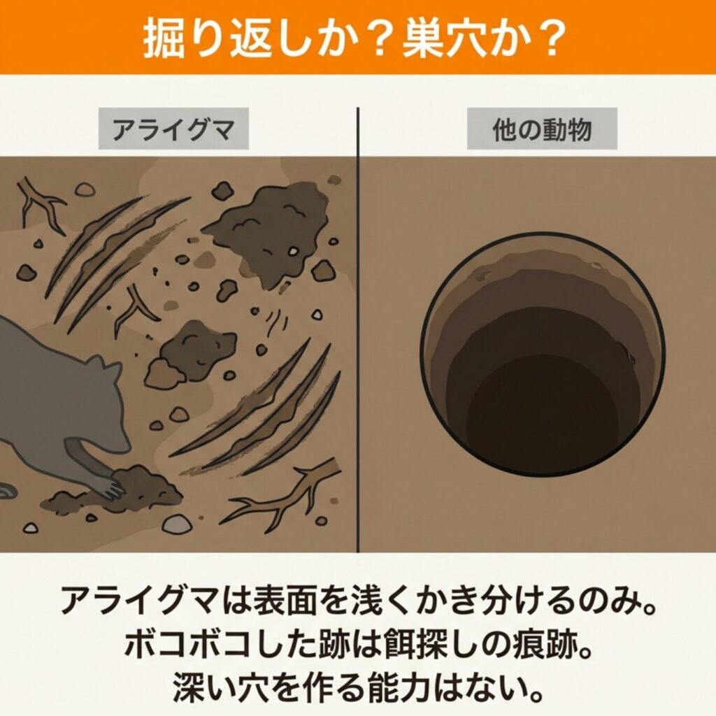 - 浅い掘り返し:アライグマ、タヌキ、イタチなどの餌探し