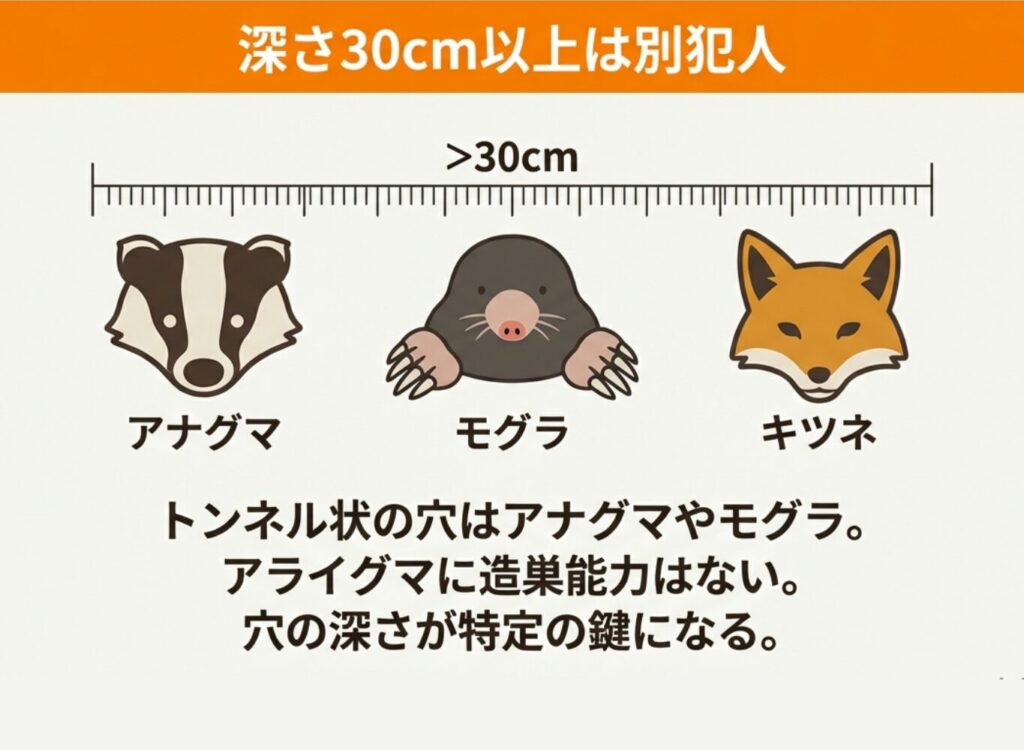 穴の犯人を特定するうえで最も参考になるのは、穴の深さと形状です。