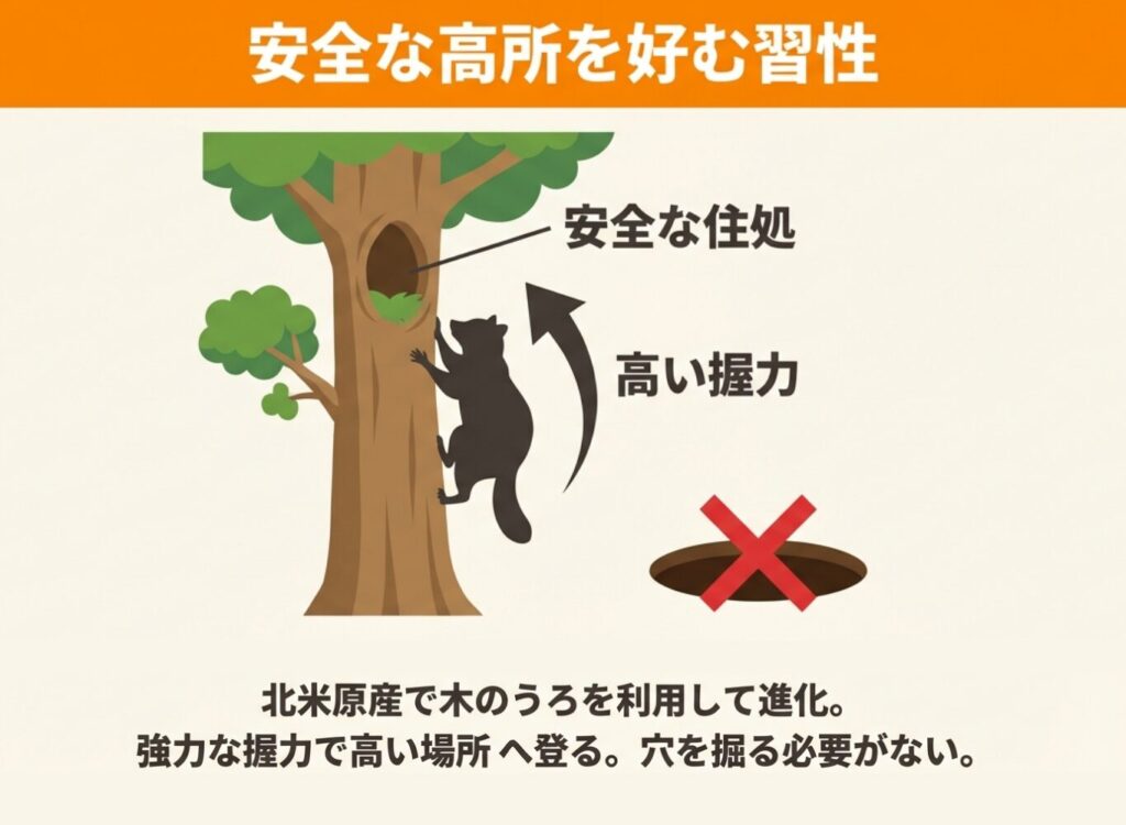 アライグマは木登りで安全な住処を確保できるため、穴を掘って巣を作る必要がないのです。