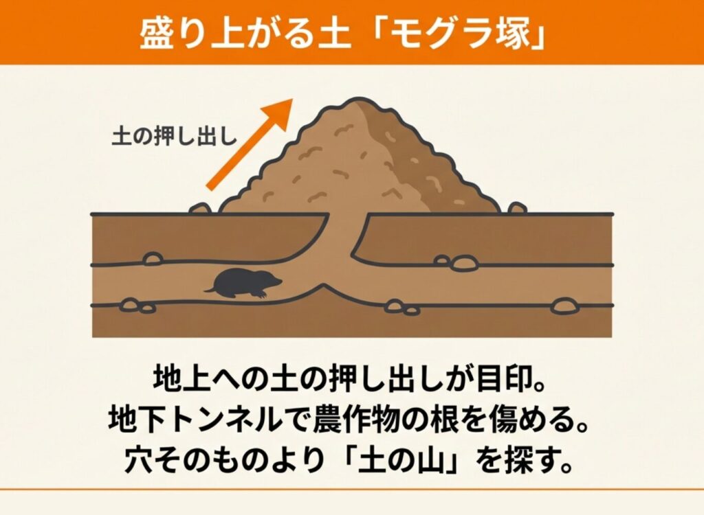 モグラは地中にトンネルを掘りながら生活しており、掘った土を地上に押し出すため、穴の周りに土が山状に盛り上がります。