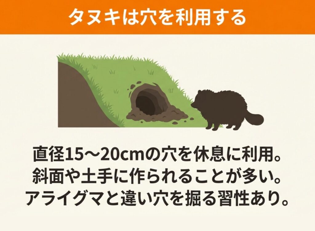 タヌキはアライグマと見た目が似ていますが、休息や子育てのために穴を掘る習性を持っています。