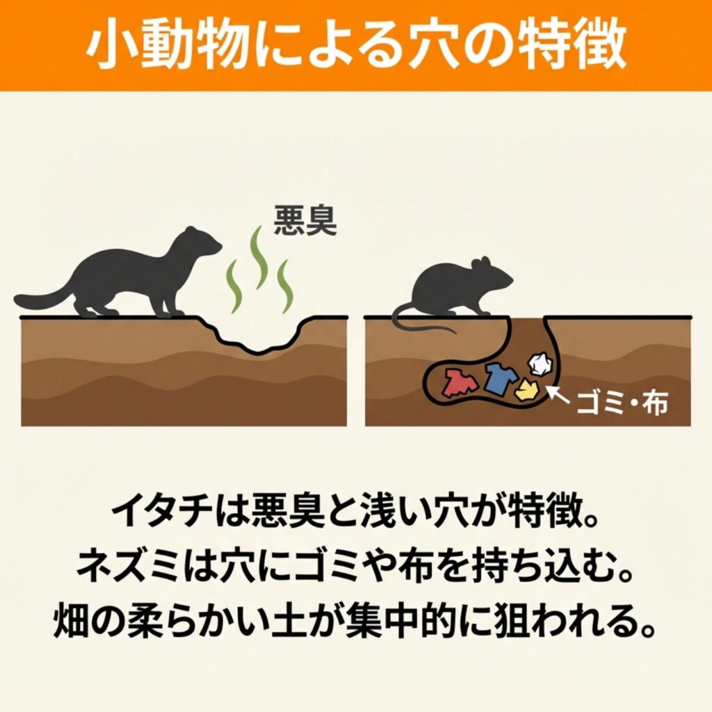 イタチは地中のミミズを狙って土を掘り返すほか、気温が安定した地中を好む傾向があり、一度耕された柔らかい畑を集中的に荒らすケースが見られます。