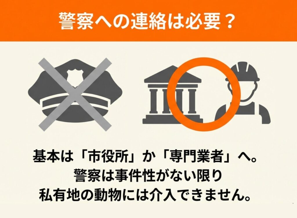 しかし、警察への連絡は基本的には必要なく、市役所や害獣駆除業者に相談すべきケースがほとんどです。