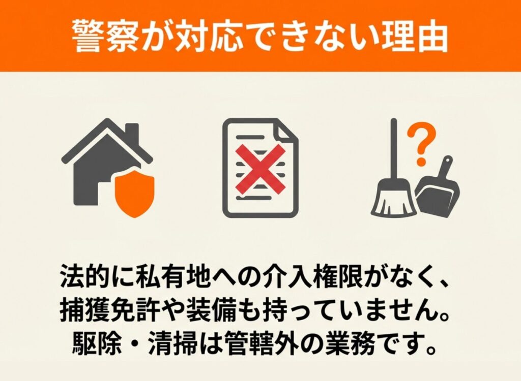 警察は事件性がない限り対応できず、駆除も職務範囲に含まれていません。