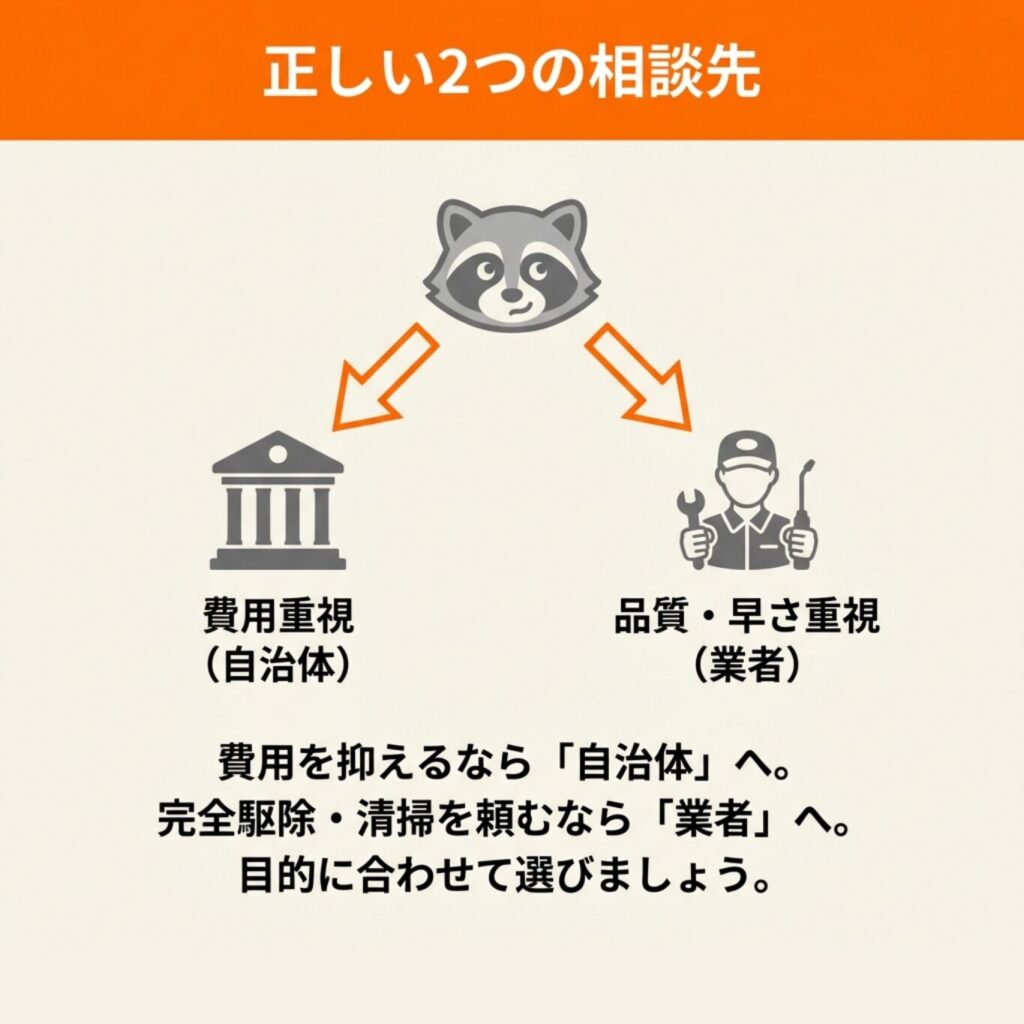 市役所と害獣駆除業者という2つの相談先について、それぞれの特徴を説明します。