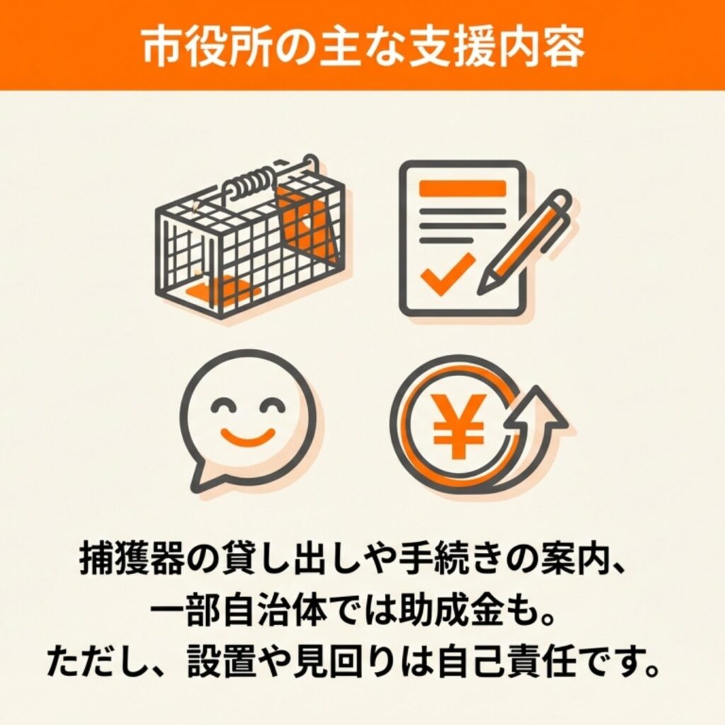 一方、市役所には環境課や保健所など害獣対策の専門部署があり、捕獲許可の申請や箱わなの貸し出し、業者の紹介といった支援を受けられます。