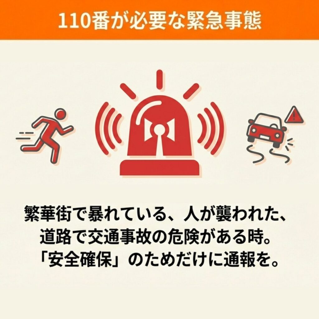 ただし、公共の場所で人に危害が及ぶ可能性がある緊急事態や、人が襲われている場合は110番通報が必要です。