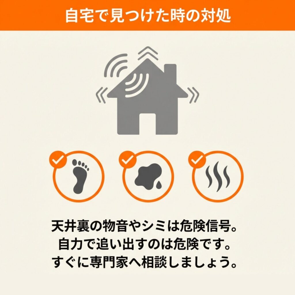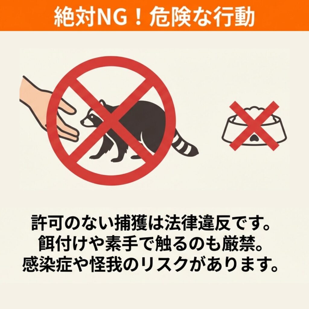 無許可での捕獲や素手での接触、フンへの接触は法律違反や健康被害につながるため絶対に避け、早期に専門家に相談しましょう。