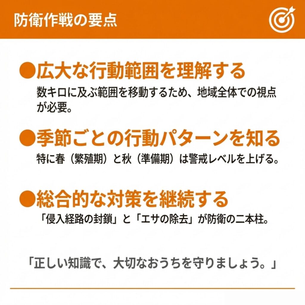 冬だからといって油断せず、侵入防止対策やエサの管理は年間を通して継続しましょう。