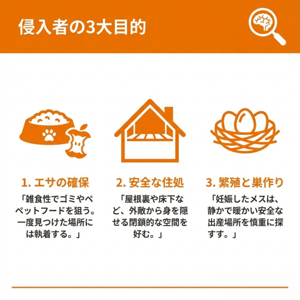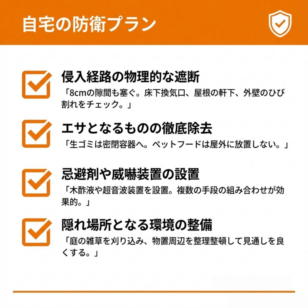 効果的な対策には、侵入経路の封鎖、エサの除去、環境整備など総合的なアプローチが必要であり、状況に応じて専門業者への依頼も検討しましょう。