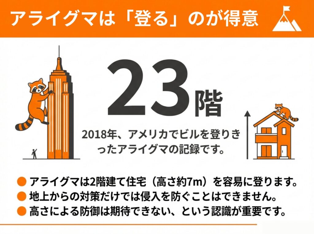 アライグマは一般的な2階建て住宅(高さ6〜7メートル)より高い場所まで登れるため、高さによる防御は期待できません。