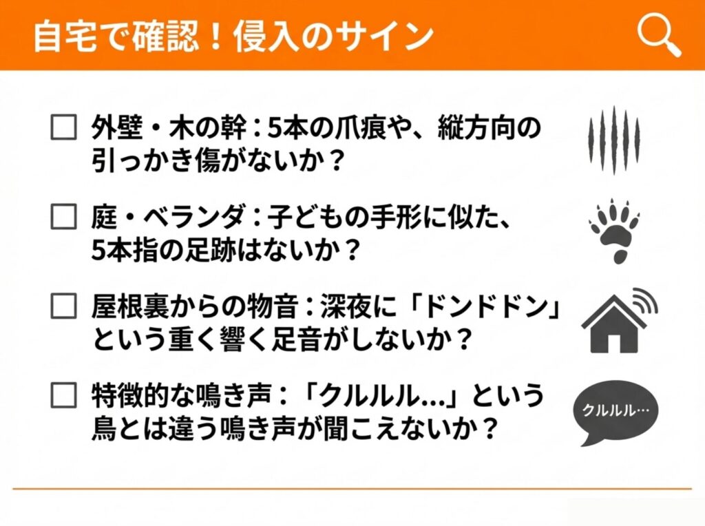 アライグマの侵入を早期に発見するには、彼らが残す痕跡や特徴的な行動を知っておく必要があります。