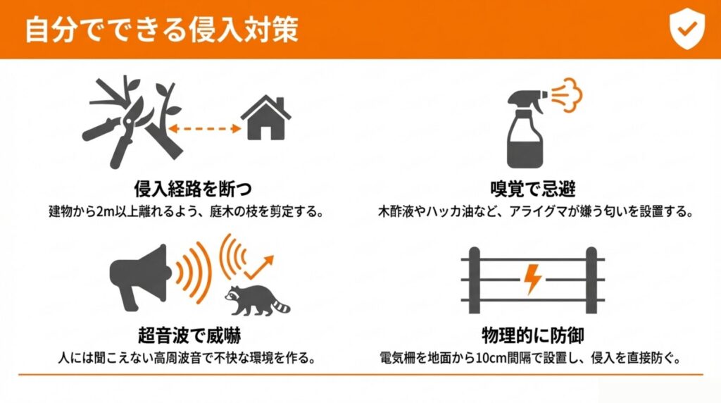 アライグマの侵入を防ぐには、物理的な環境改善から化学的な忌避手段まで複数のアプローチが必要です。