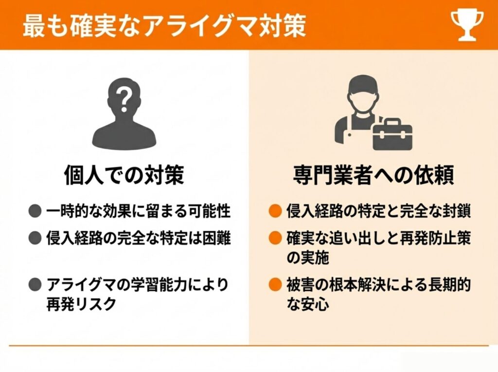 個人でできる対策には限界があり、アライグマの学習能力の高さを考えると専門家の力が必要です。