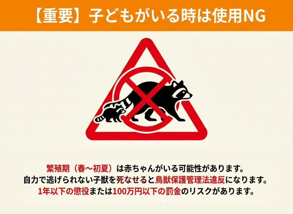 間違った方法で使用すると効果が半減するだけでなく、アライグマを逃げ場のない場所に追い込んでしまうおそれもあります。