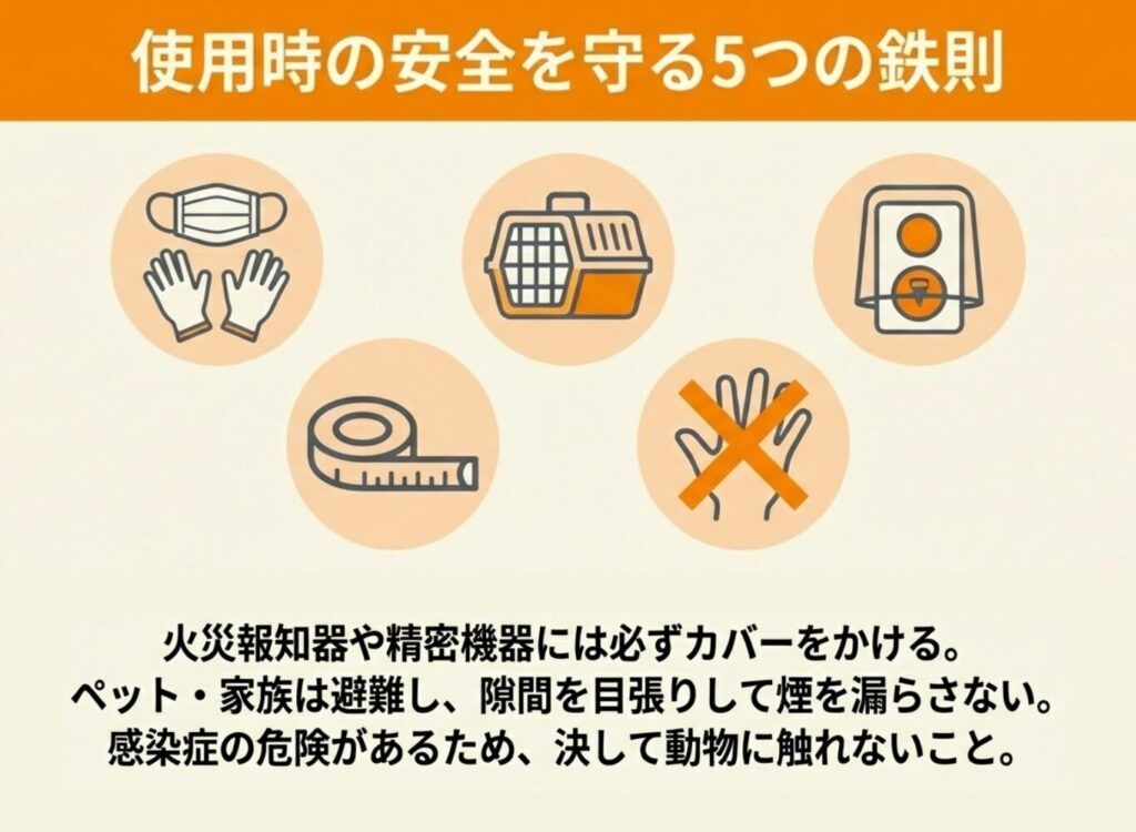 害獣用くん煙剤を使用する際は、バルサンと同様に火災報知器へのカバーや換気などの事前準備を忘れずに行いましょう。