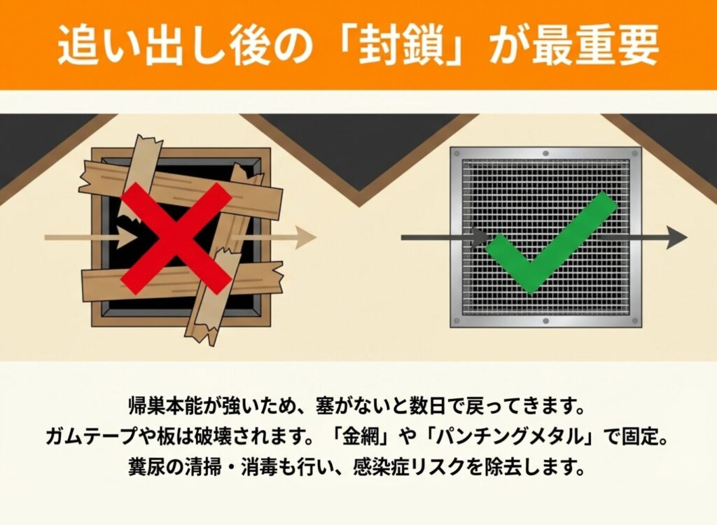 追い出した後は金網やパンチングメタルで侵入経路を封鎖し、糞尿の清掃・消毒まで行うことで被害の再発を防ぐことができます。