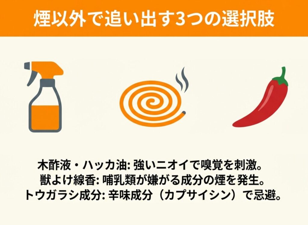 嗅覚が鋭い動物ほど刺激を強く感じるため、煙とニオイの相乗効果によって追い出しが成功するケースも少なくありません。