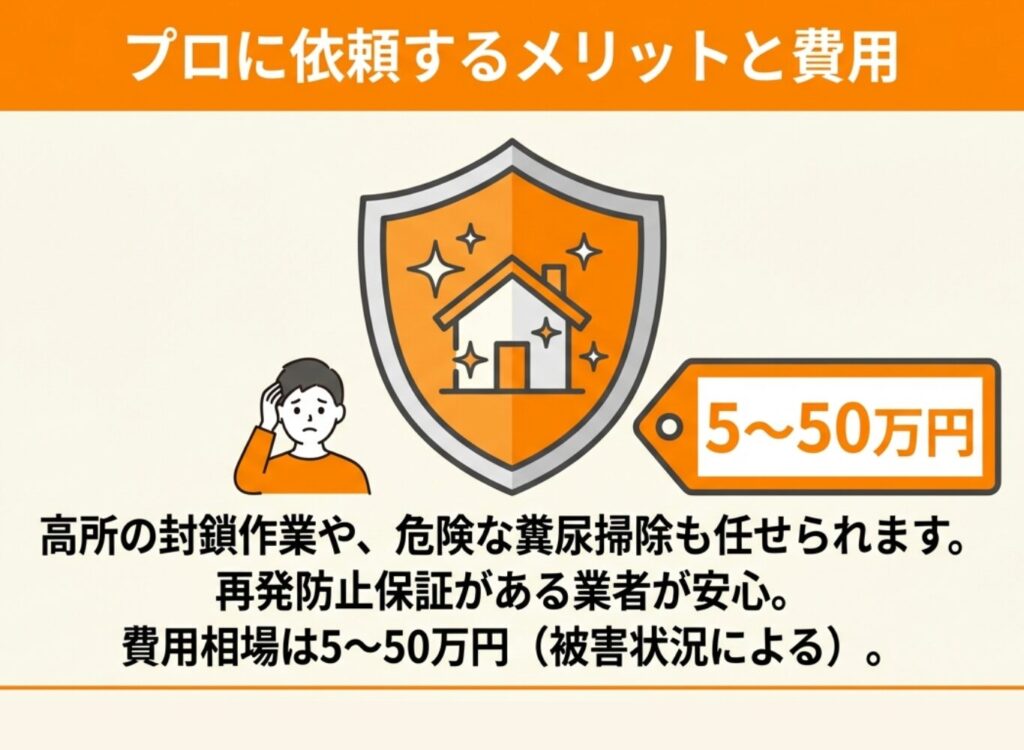 軽度の被害であれば5万円以下で対応できることもありますが、広範囲の侵入経路封鎖や大量の糞尿清掃が必要な場合は高額になることもあります。