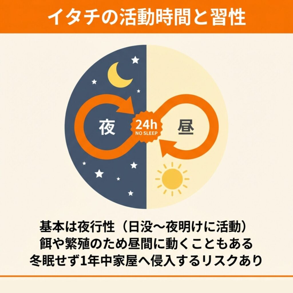 イタチは夜行性ですが、日中も活動することがあるため注意が必要です。