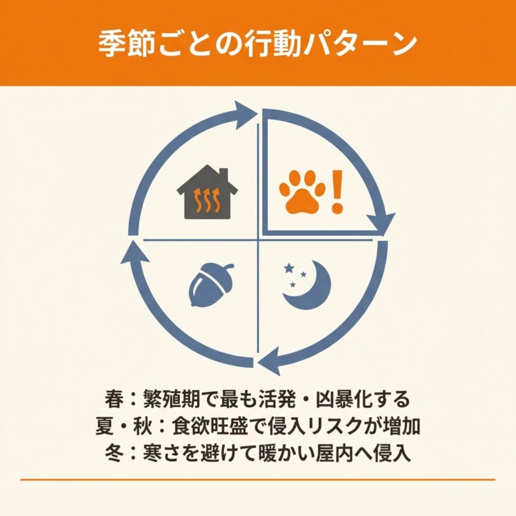 季節ごとの活動パターンを理解すれば、より効果的な対策ができるでしょう。
