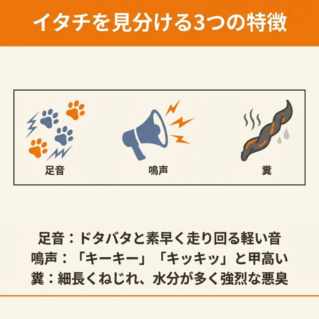イタチの足音や物音には、特徴的なパターンがあります。