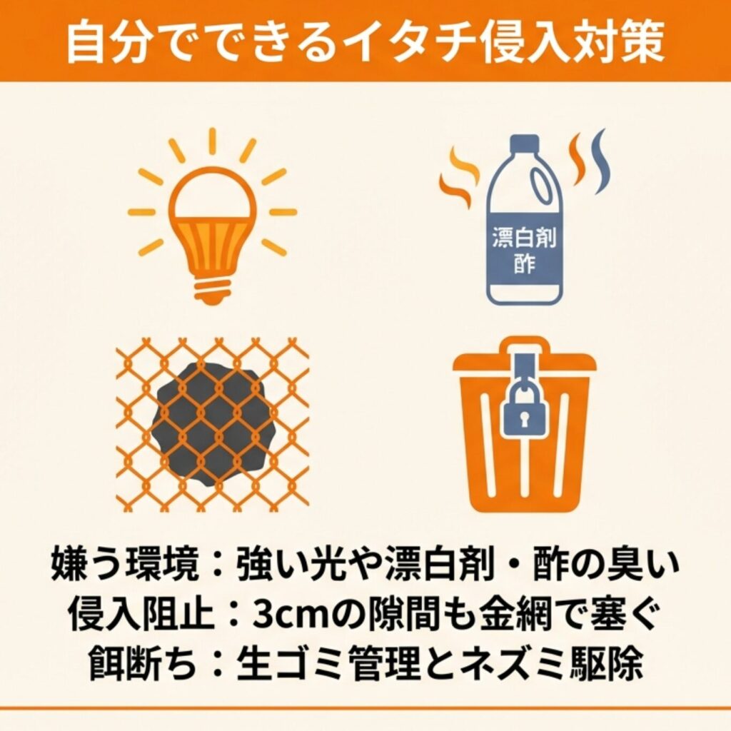 自力での対策としては忌避剤の使用や侵入経路の封鎖が効果的ですが、完全駆除が難しいケースも多いでしょう。